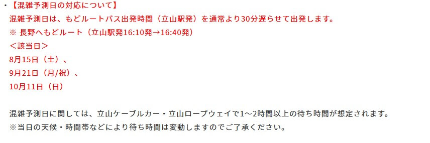 | ⚠︎混雑予測日の対応について | [*]シーズン期間中の混雑が予想される特定の日にあたる場合は、バス出発時間を30分遅らせて出発いたします。その後の行程時間もすべて後ろ倒しとなります。ご予定の際は、時間変更にご注意ください。 <混雑予測日> 8月15日(土)、 9月21日(月/祝)、10月11日(日) |